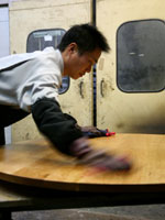 テーブルの最終工程である、仕上げ、検品、梱包が私の仕事です。いつも朝礼のとき全スタッフで確認していることがあります。それは間違えのない、満足していただける製品、そして返品のない製品つくりを心がけることです。「不良品は工場から一切出さない」が私のモットーです。